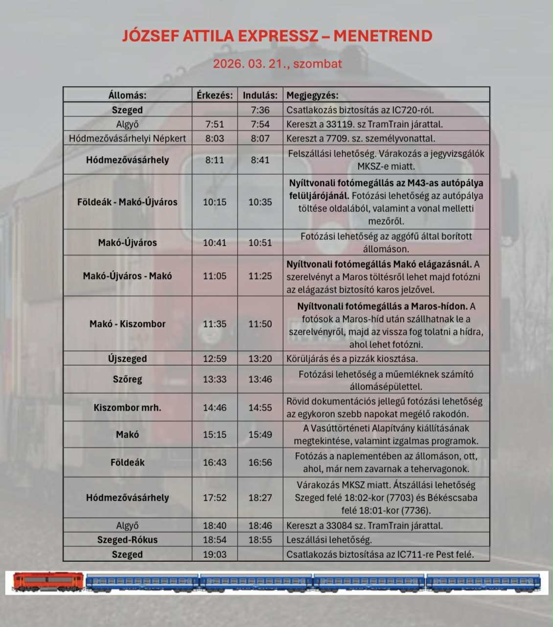 A különvonat 7:36-kor indul Szegedről, az IC720-as beérkezése után, de lesz lehetőség felszállásra Hódmezővásárhelyen és Makón is még Újszeged felé.